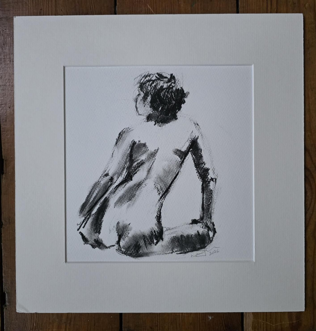 Life drawing from a session with the Hesketh Hubbard Society. Willow charcoal on textured paper, semi fixed with a Winsor and Newton professional fixative.